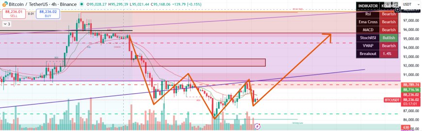 timeframe yang lebih singkat; Bitcoin membentuk pola inverse head and shoulder, peluang untuk kembali bullish ke level harga $95.000 membesar jika Bitcoin mampu closing secara candle 4 hours diatas garis trendline miring ungu.